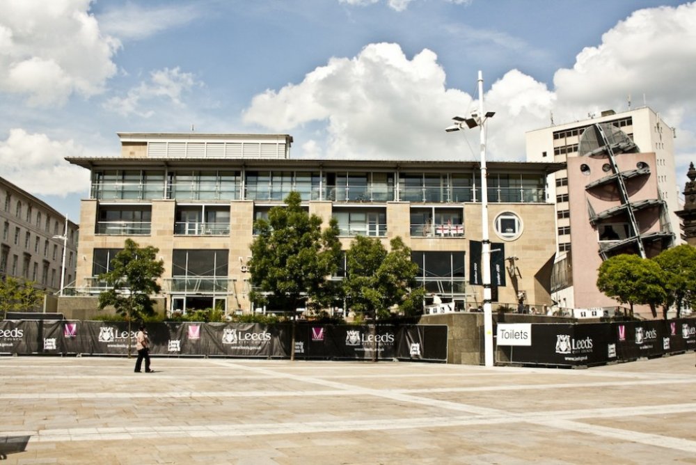 Getting there: From Leeds Railway Station head straight North up Park Row, you'll pass several large banks (this is the core of Leeds' banking and business district) and a Wetherspoons' pub called "Becketts Bank". Keep going and eventually you'll see that weird rugby-ball / crashing space-ship thing on the right of the attached image directly ahead, outside the Leeds City Museum. The pub is the large Yorkshire Stone building behind the sculpture, looking over Millennium Square.