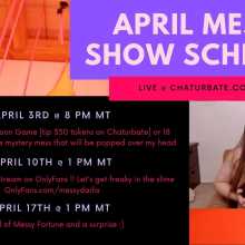 Hi all !! Messy Darla here. I'll be back on Chaturbate for a live messy show this Friday, April 3rd. I'll be online from 8 pm - 2 am MT and will be bringing back the Mystery Mess Balloon Game :)
