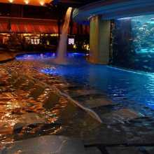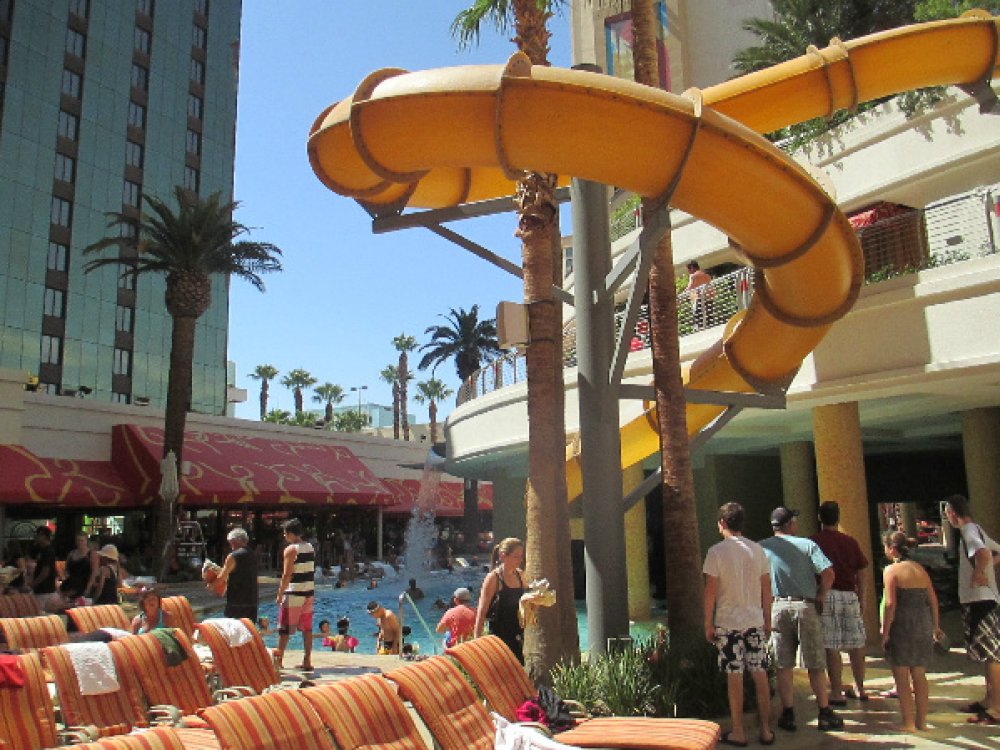 We chillin by the pool at the old skool Golden Nugget hotel. There is a huge shark tank that you can swim all the way around, and a water slide that goes right through it.